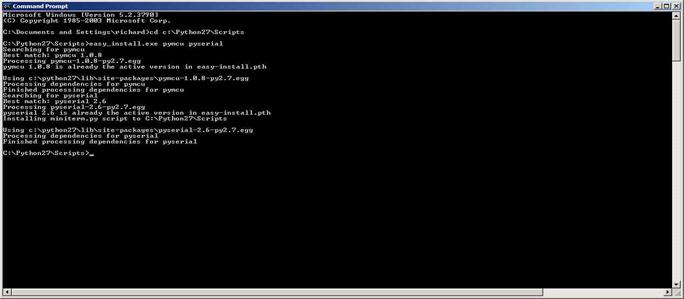 If you are comfortable in the windows command prompt you can follow along and manually install the python module below, if not you can download and run this install batch script to make it easier: install_module.bat or if you want to run the command prompt but don't want to manually navigate around you can copy and paste this line into the command prompt: c:\Python27\Scripts\easy_install.exe pyserial pymcu